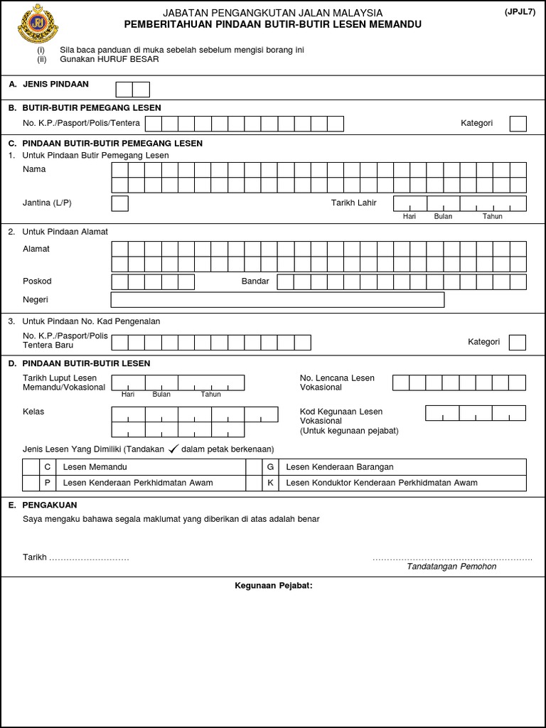 Jpjl7 Permohonan Pindaan Maklumat Lesen Memandu