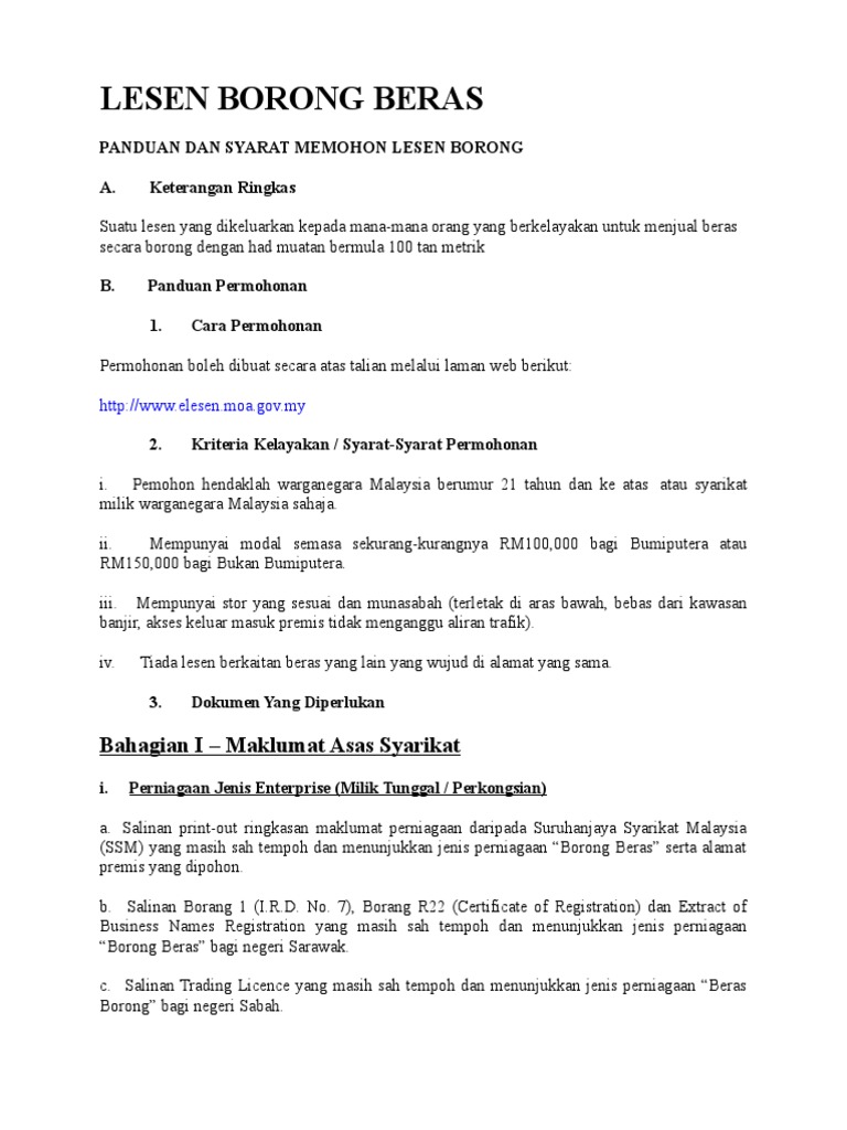 67 people like this. Salinan print-out ringkasan maklumat perniagaan daripada Suruhanjaya Syarikat Malaysia SSM yang masih sah tempoh dan menunjukkan jenis perniagaan Borong Beras serta. Syarikat telah mendapat Lesen Borong Beras pada 2009 yang dikeluarkan oleh pihak Kementerian Pertanian Dan Industri Asas Tani MOA.